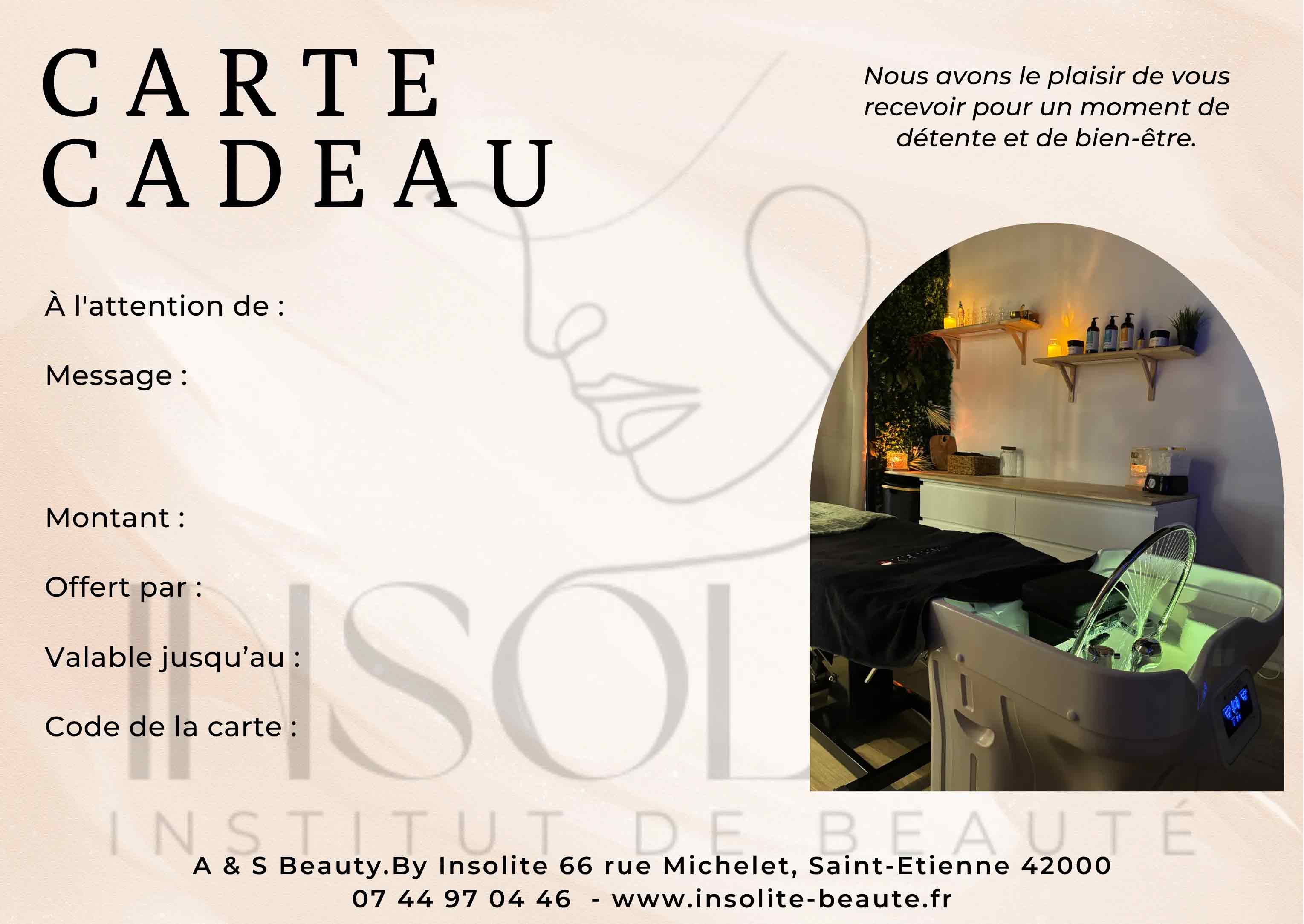 🎁 Offrez une pause bien-être 100 % personnalisée avec la carte cadeau Insolite Beauté ! Choisissez le montant que vous souhaitez offrir, et laissez la personne gâter son corps et son esprit selon ses envies.